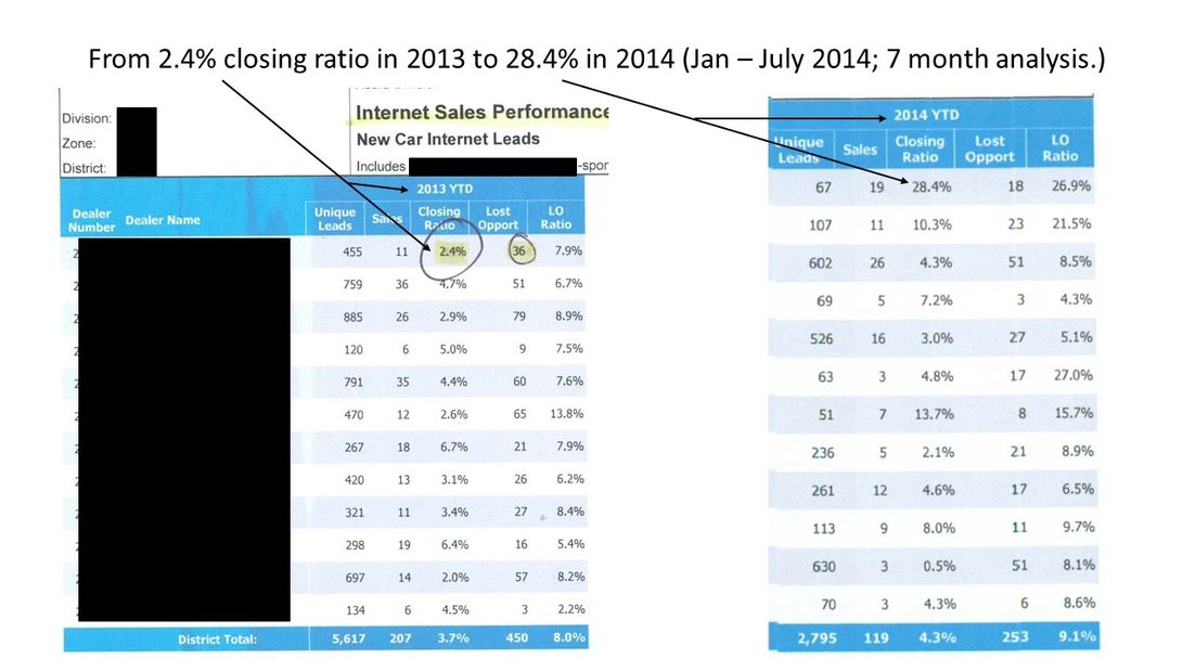 We will develop operating standards and procedures with traffic monitoring, detailed performance analysis and training for sales departments which can dramatically increase internet vehicle sales, in-store sales, and achieve high closing ratios in your district while integrating most up-to-date technology accelerators with time-tested and effective traditional sales techniques and practices.